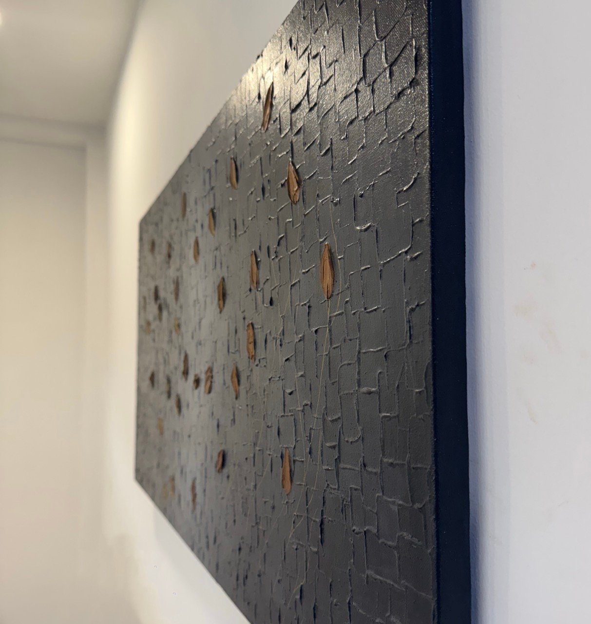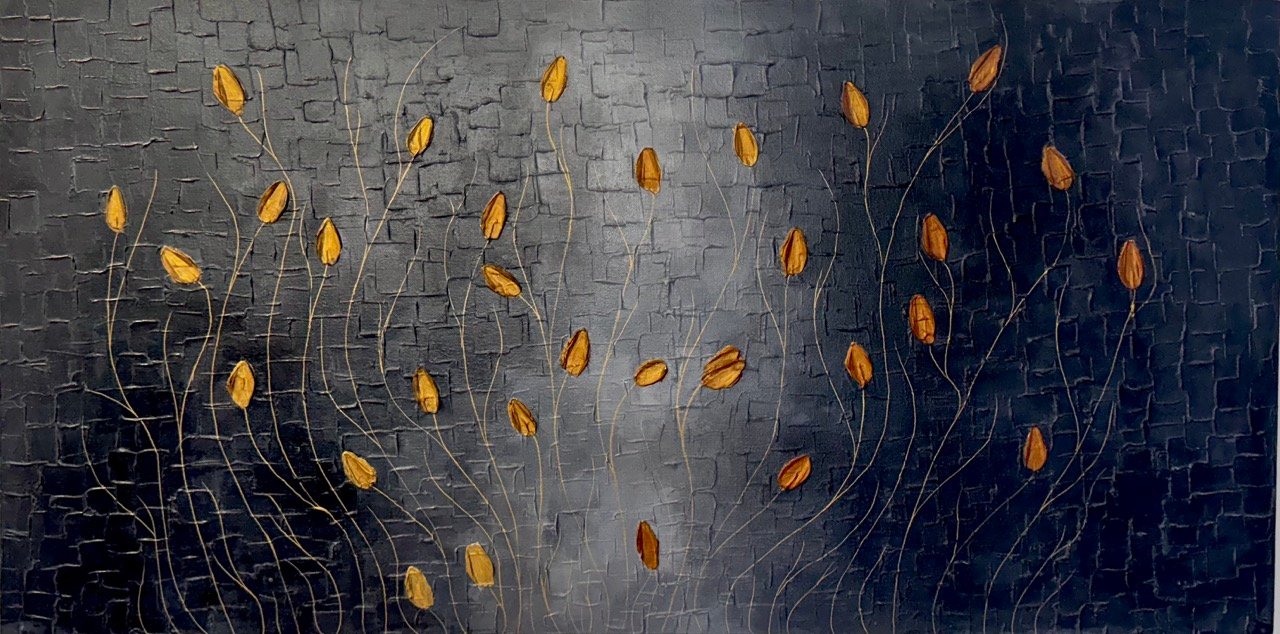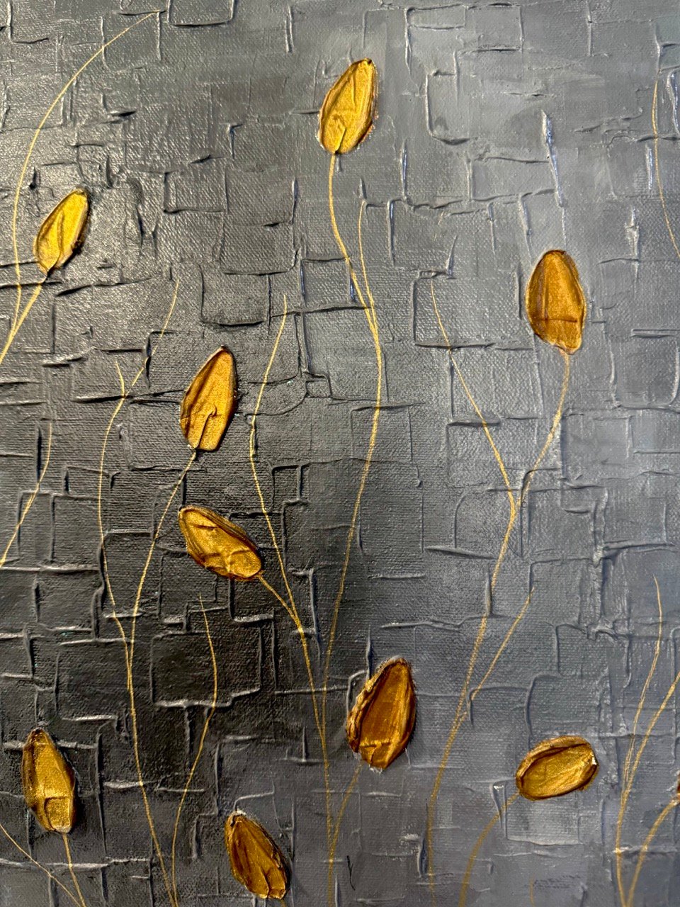 "Gilded Breeze" captures movement and elegance through its delicate gold accents against a textured, dark backdrop.