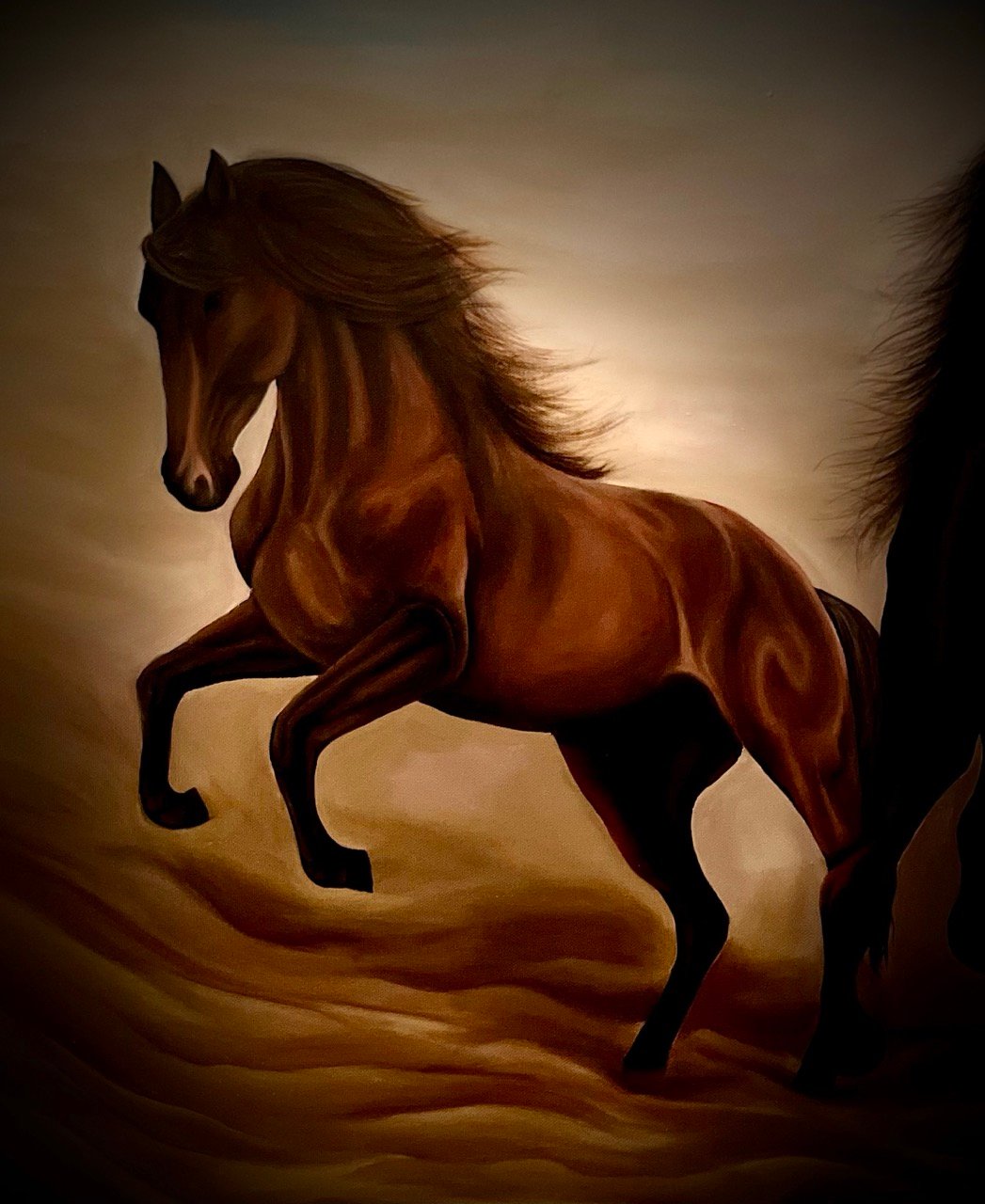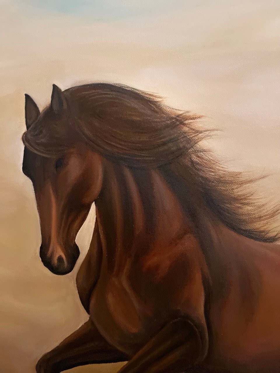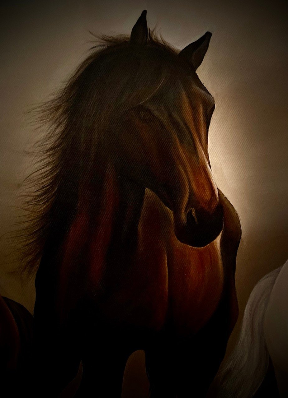 A Vastu-compliant painting, "Power Unleashed" embodies success, speed, and strength, attracting positive energy. The three galloping horses symbolize determination and momentum, their flowing manes evoking freedom and power.